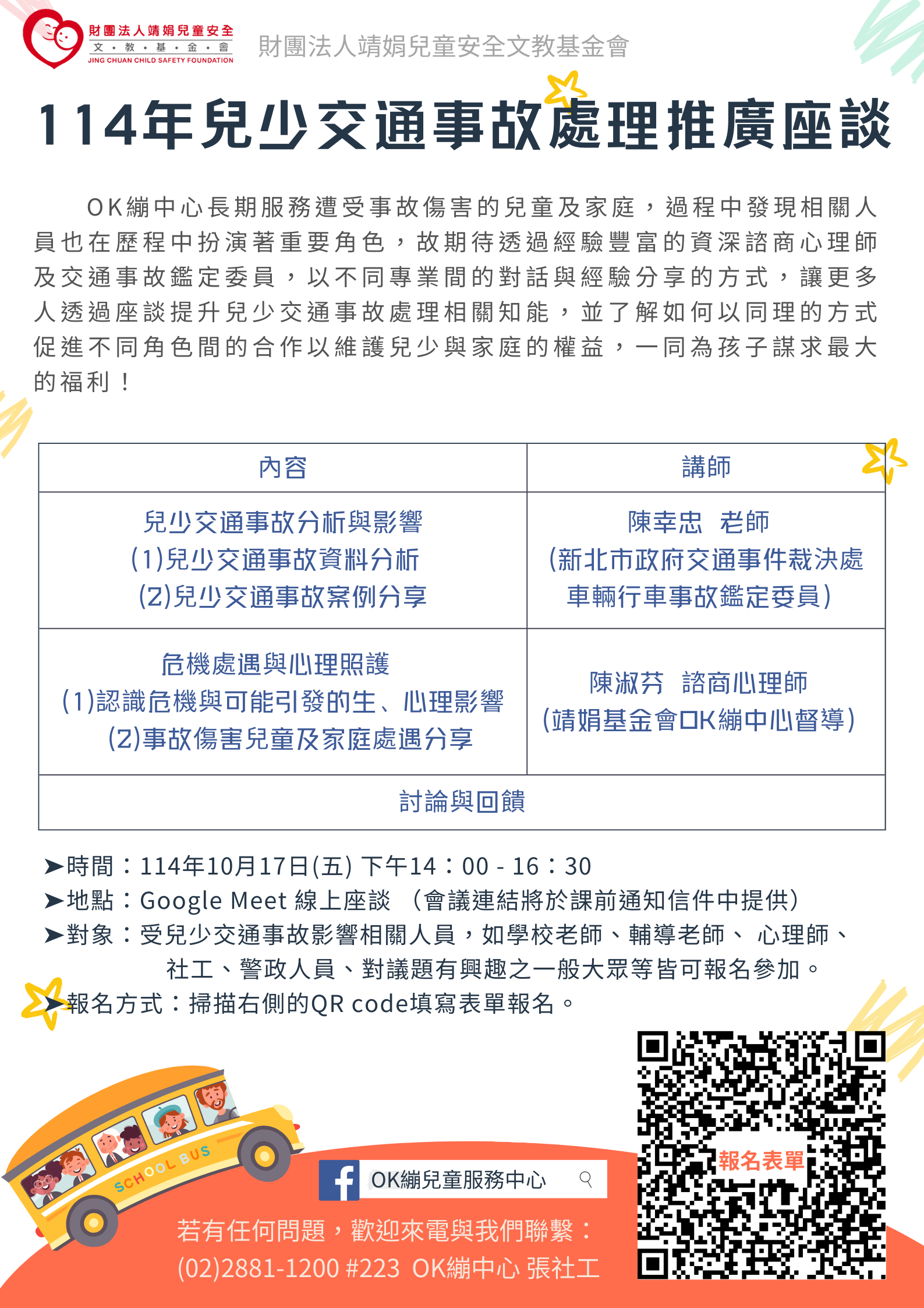 財團法人靖娟兒童安全文教基金會OK繃兒童服務中心訂於114年10月17日辦理線上「114年兒少交通事故處理推廣座談」。
