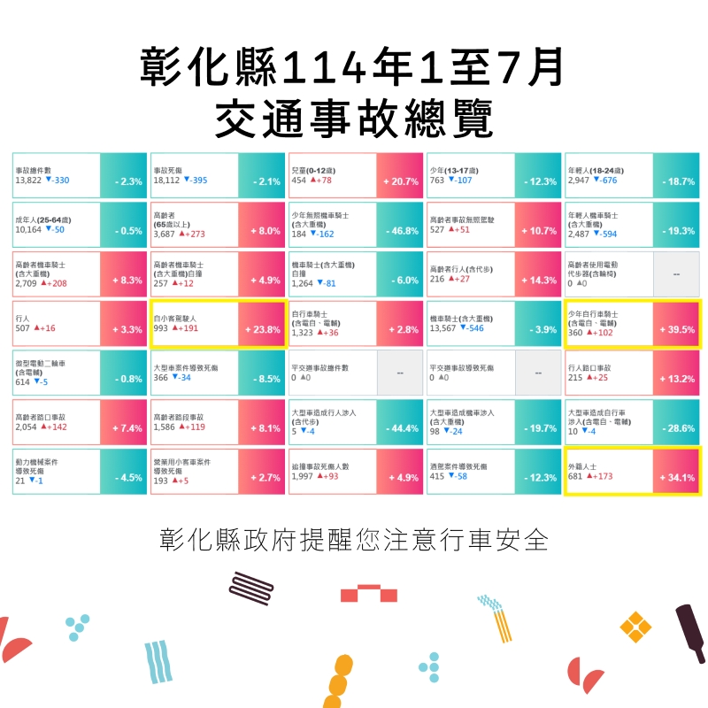 - 根據交通部道安資訊查詢網統計快覽數據跟112年同期比較分析,以少年自行車騎士(含電自、電輔) 事故增加39.5%最高,外籍人士事故增加34.1%次之,自小客車駕駛人增加23.8%再次之。1-7月份30日鄉鎮市每千人死傷人數於「彰化市、員林市、二林鎮、和美鎮」為多,肇事熱點以「彰化市」為多,合先敘明。