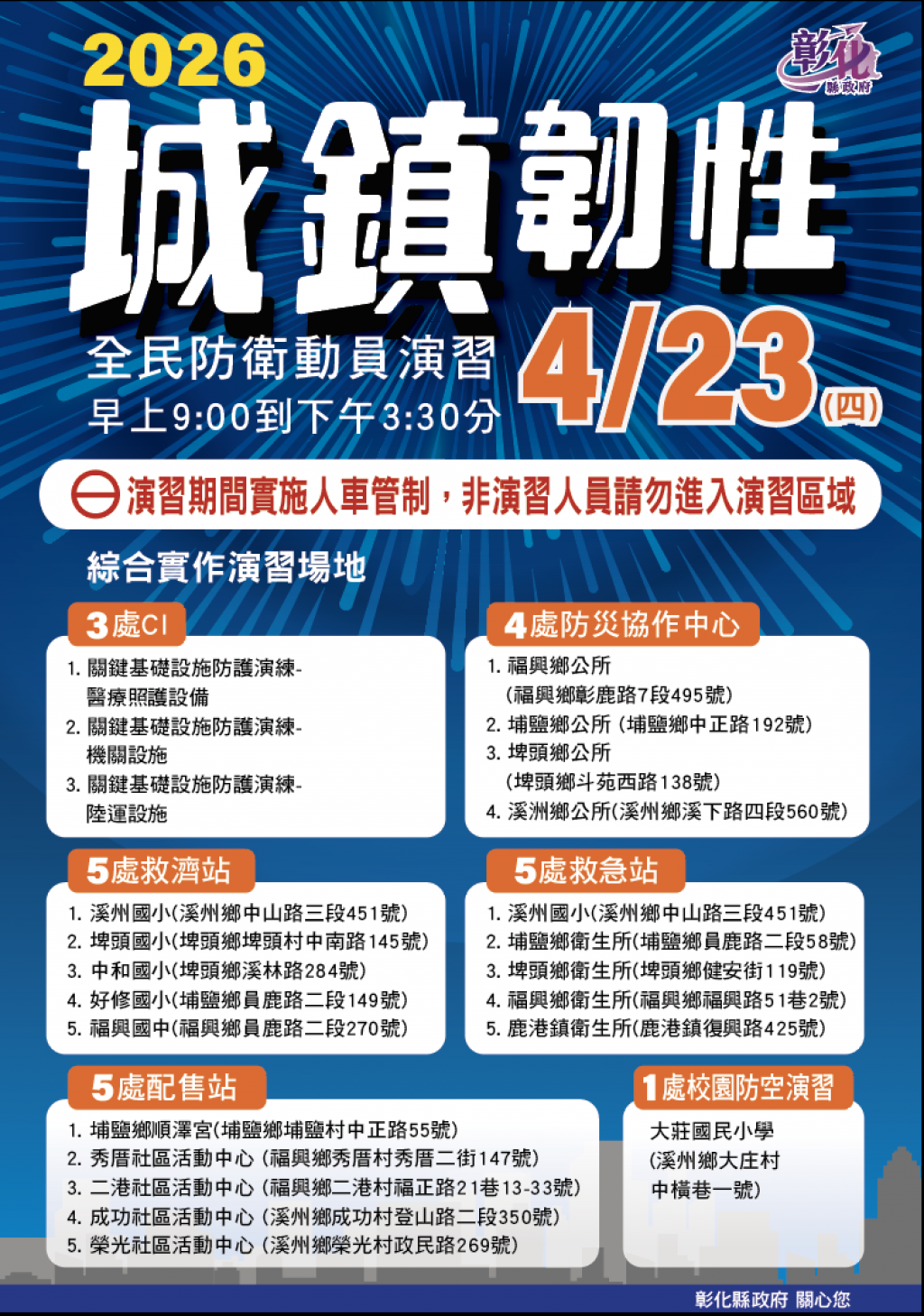 彰化縣政府謹訂於115年4月23日(星期四)於福興鄉、埔鹽鄉、埤頭鄉、溪州鄉等4個鄉(鎮、市)辦理彰化縣2026城鎮韌性(全民防衛動員)演習。 內政部消防署「爭取三天,爭取更多時間」影片 https://www.youtube.com/watch?v=qlgu_XJxuPA 師生及民眾請下載「警政服務APP」、「消防防災e點通APP」,可多加利用。